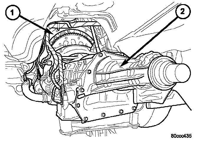11. Raise transmission and align the torque converter with the drive plate and the transmission converter housing with the engine block.