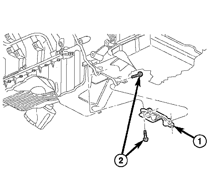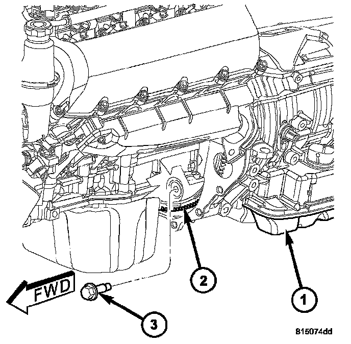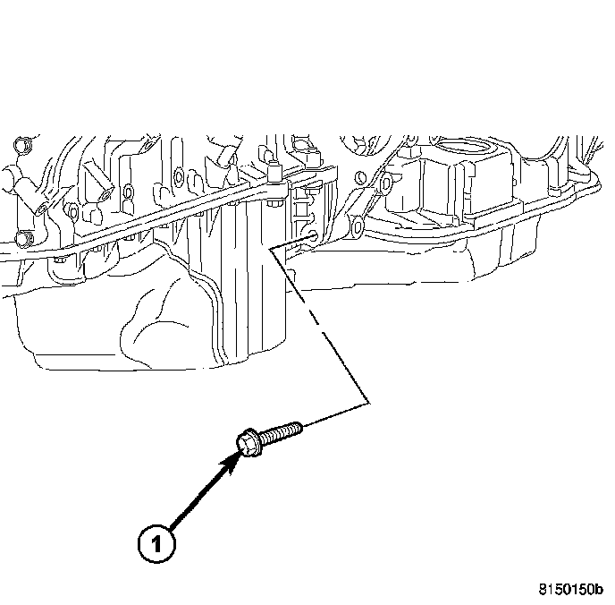 16. Install both the left and right side oil pan to transmission bolts (1), 5.7L only. Torque the bolts to 54 Nm (40 ft. lbs.).