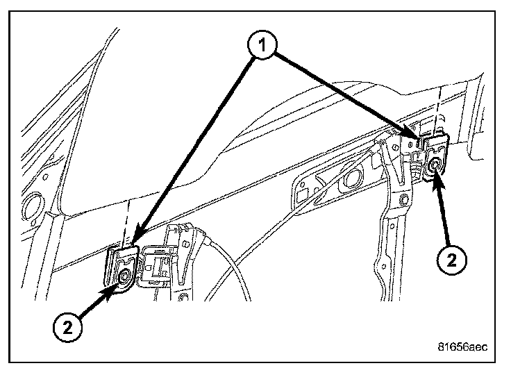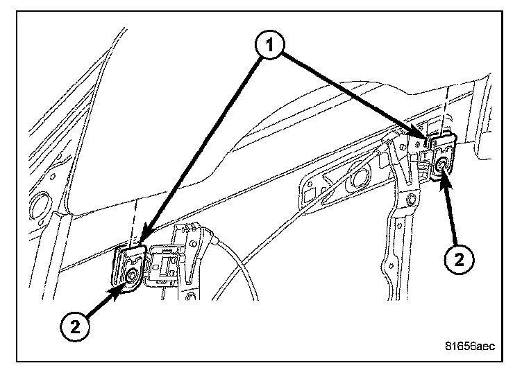 3. Loosen the bolt (2) in each of the window regulator glass clamps (1) just far enough to release the door glass from the clamps. Do not loosen completely.
