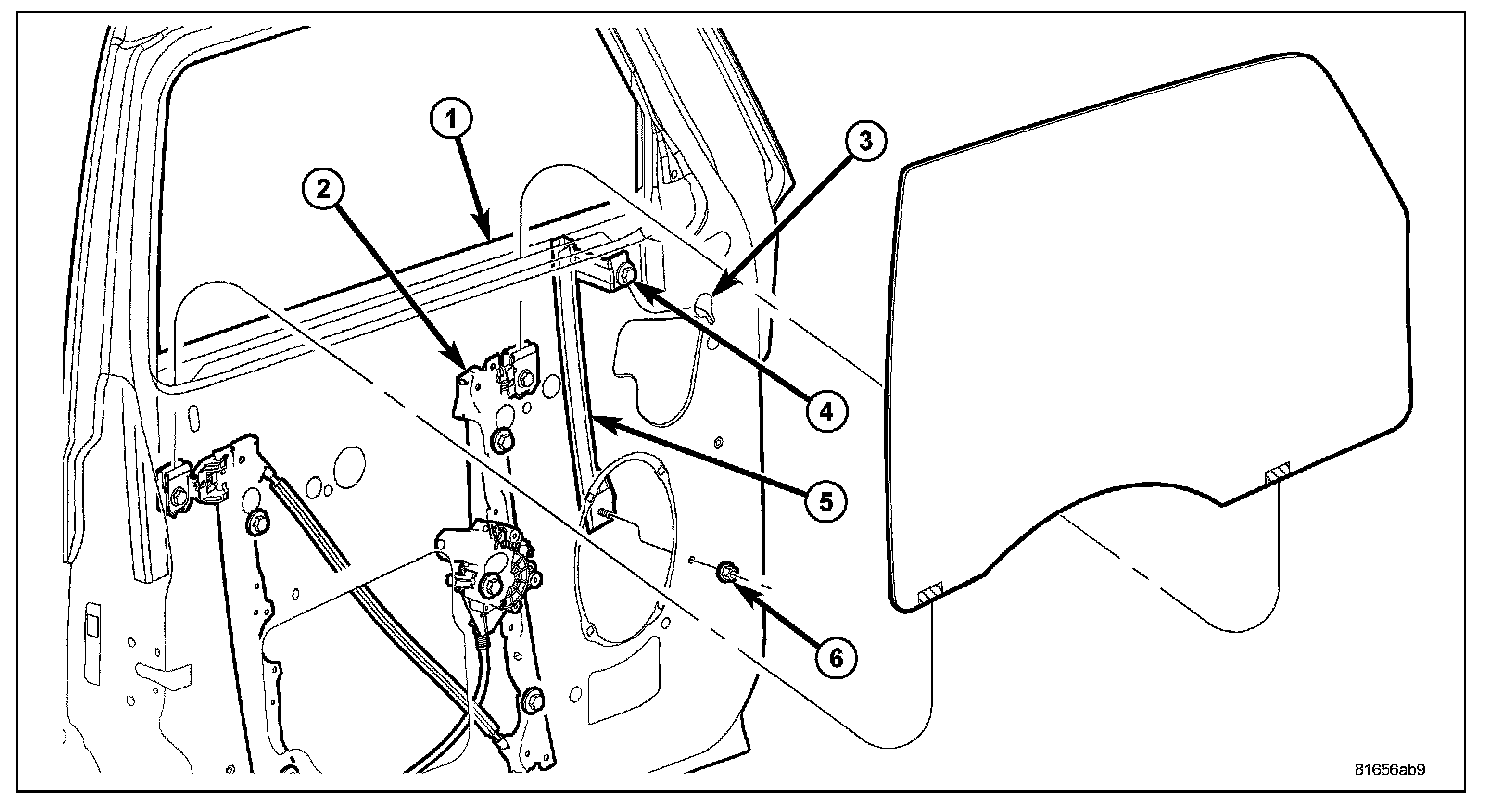 4. Disengage the door glass from the window regulator glass clamps by lowering the regulator down as required for access to remove the door glass.