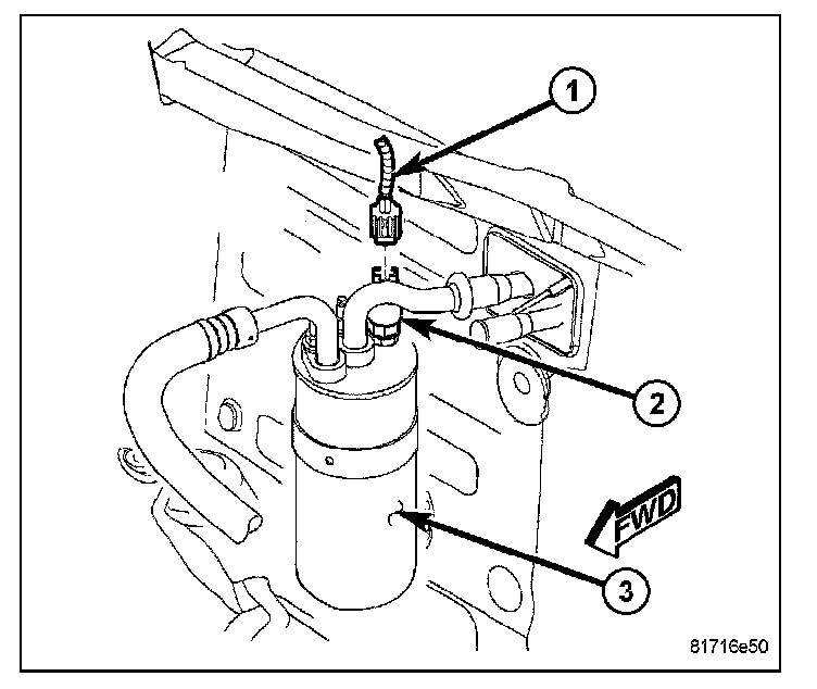 2. Install the A/C low pressure switch (2) onto the top of the A/C accumulator (3). Hand-tightened the switch securely.