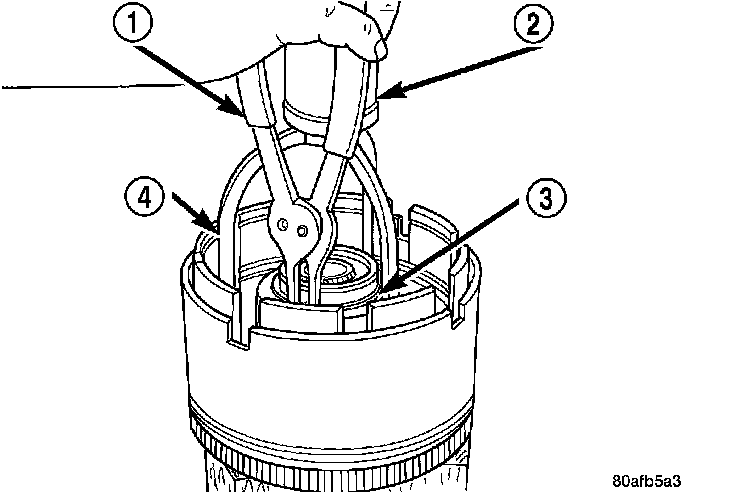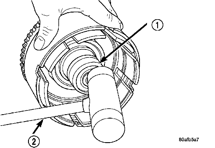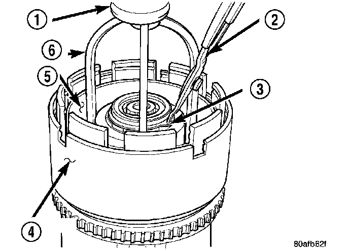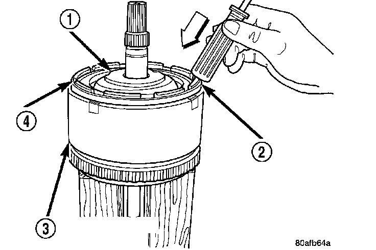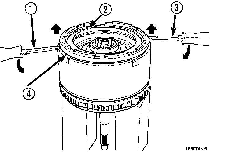 2. Tap down (2) reverse clutch reaction plate (4) to release pressure from snap ring.