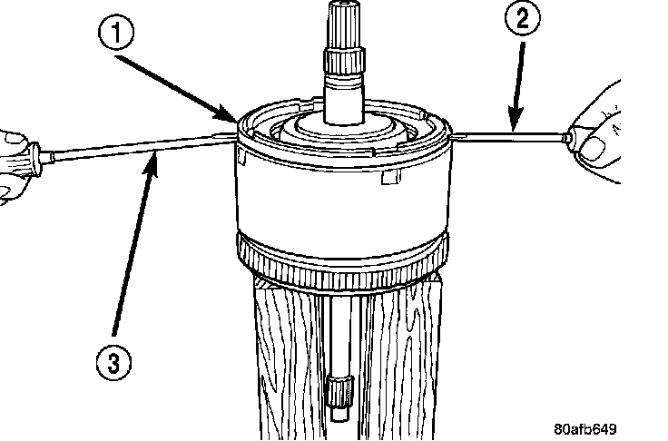 28. Remove the OD/Reverse piston return spring (2) and snap ring (3).