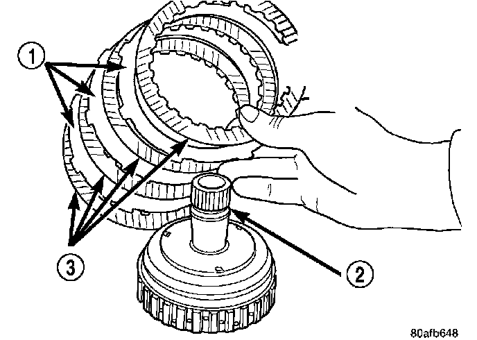12. Install the UD clutch pack (four fibers/four steels) (1, 3). Leave the top disc (2) out until after the snap ring is installed.