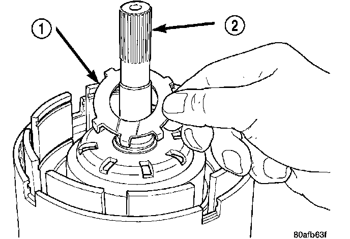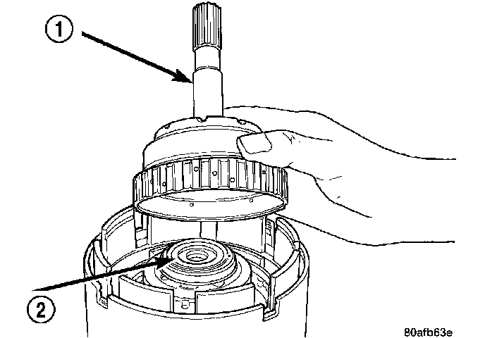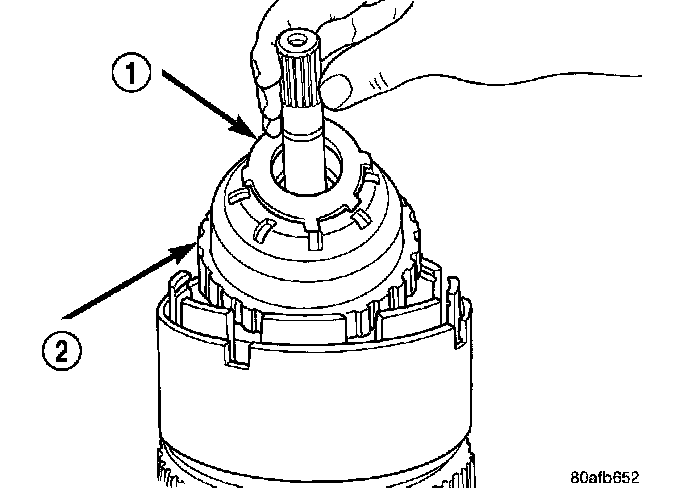6. Install the input hub/shaft assembly (1) to the OD/Reverse piston/clutch retainer assembly (2).