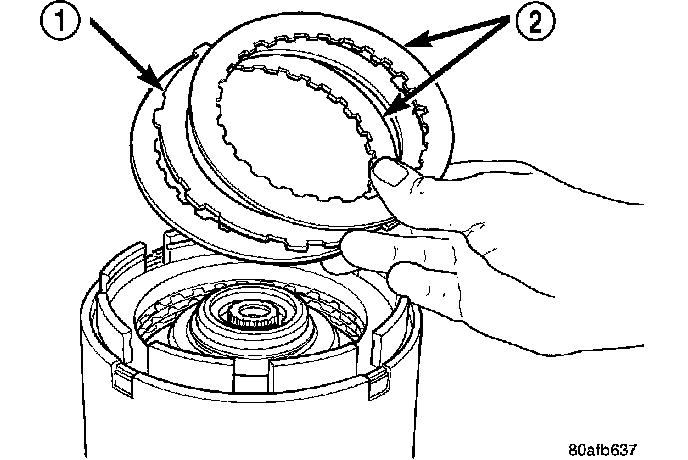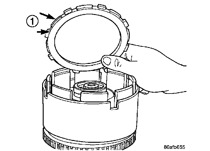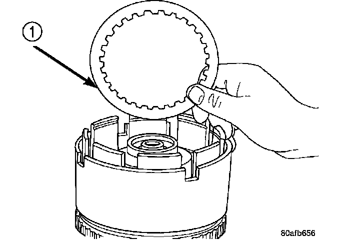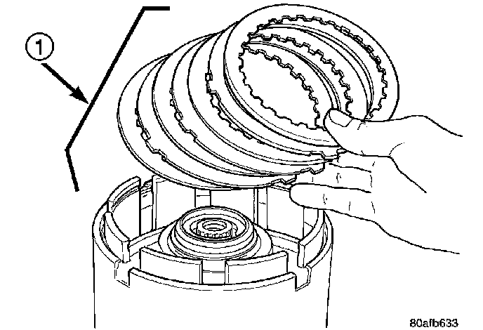 24. Install the OD clutch pack (four fibers/three steels) (1).