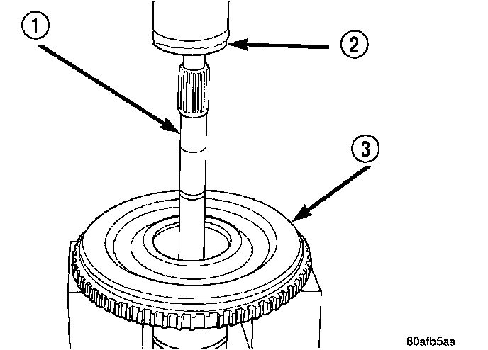 30. Using a suitably sized socket (2) and an arbor press (1), remove input shaft (5) from input shaft hub.