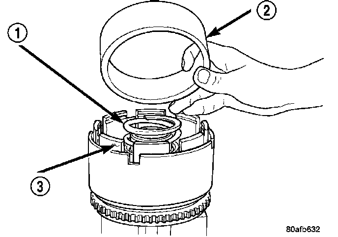 3. Position the OD/Reverse piston return spring (2) and snap ring (3) onto the OD/Reverse piston (1).