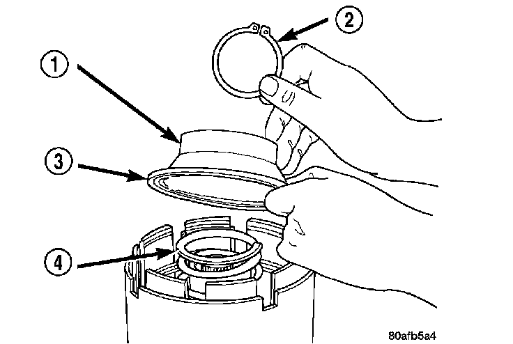 10. Position the UD spring retainer (1) and snap ring (2) on the piston return spring (4).