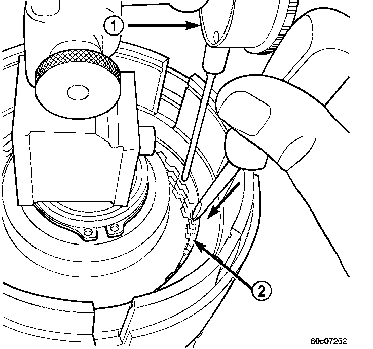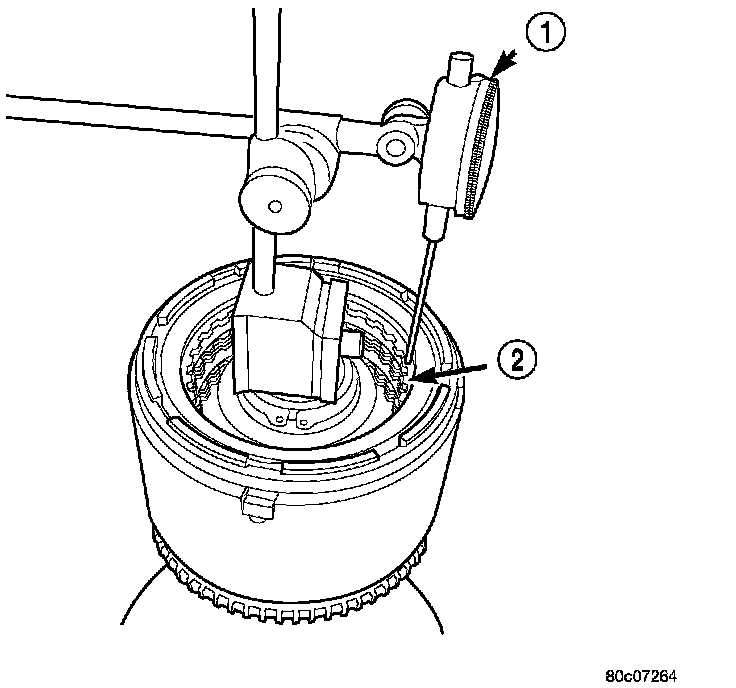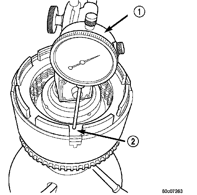 28. Measure OD clutch pack clearance. Set up Dial Indicator C-3339 (1) on top of the OD/Reverse reaction plate (2).