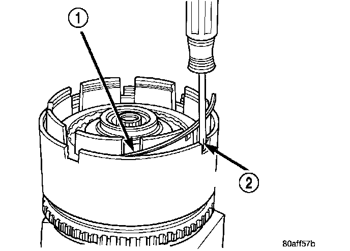 NOTE: Snap ring ends must be located within one finger of the input clutch hub. Be sure that snap ring is fully seated, by pushing with screwdriver, into snap ring groove all the way around.
