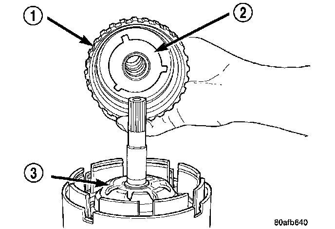11. Remove the overdrive clutch (1, 3) from the overdrive hub/shaft (2).