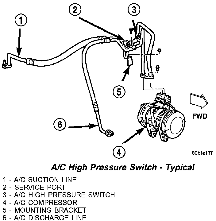 NOTE: It is not necessary to discharge the refrigerant system to replace the A/C high pressure switch.