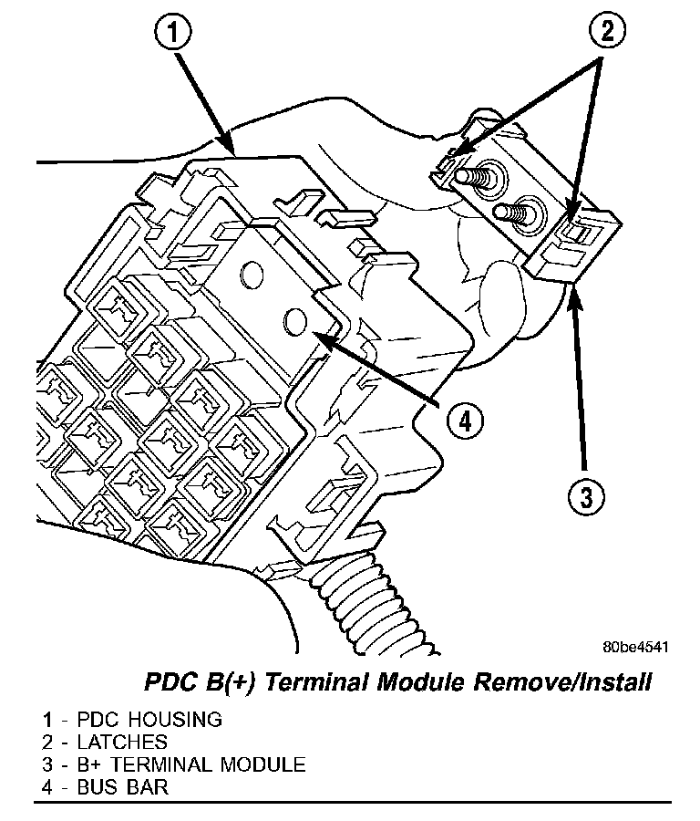 The Power Distribution Center (PDC) cover, the PDC housing lower cover, the PDC relay wedges, the PDC relay cassettes and the PDC B(+) terminal stud module are available for service replacement. The PDC cover can be simply unlatched and removed from the PDC housing without the PDC being removed or disassembled. Service of the remaining PDC components requires that the PDC be removed from its mounting and disassembled.