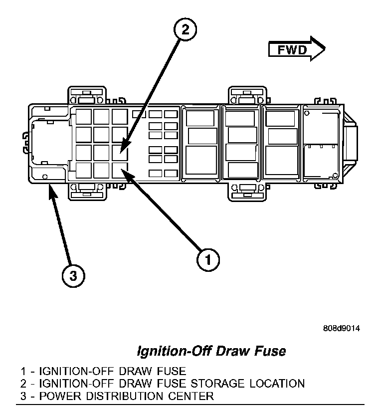 All vehicles are equipped with an Ignition-Off Draw (IOD) fuse that is removed from its cavity in the Power Distribution Center (PDC) when the vehicle is shipped from the factory. Dealer personnel are to remove the IOD fuse from the storage location and install it into PDC fuse cavity 15 as part of the preparation procedures performed just prior to new vehicle delivery.