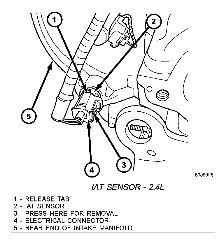 The intake manifold air temperature (IAT) sensor is installed into the intake manifold plenum at the rear end of the intake manifold.
