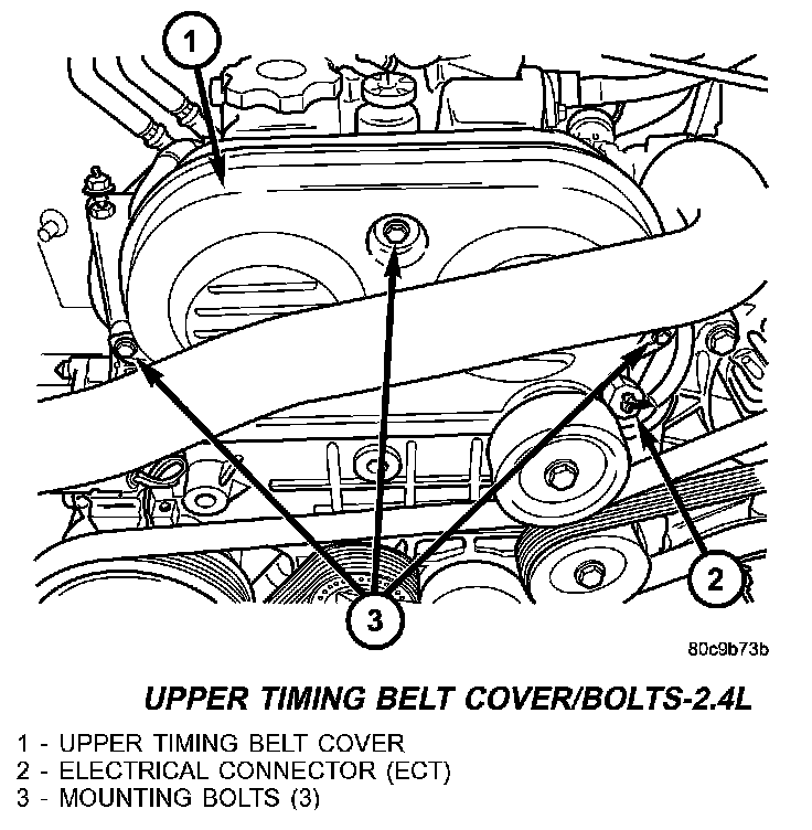 1. Remove plastic, upper timing belt cover (timing gear cover) by removing 3 bolts. Before attempting to remove cover, remove electrical connector from Engine Coolant Temperature (ECT) sensor. This will prevent damage to sensor.