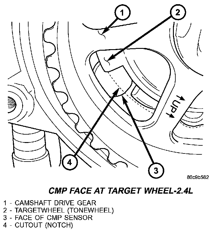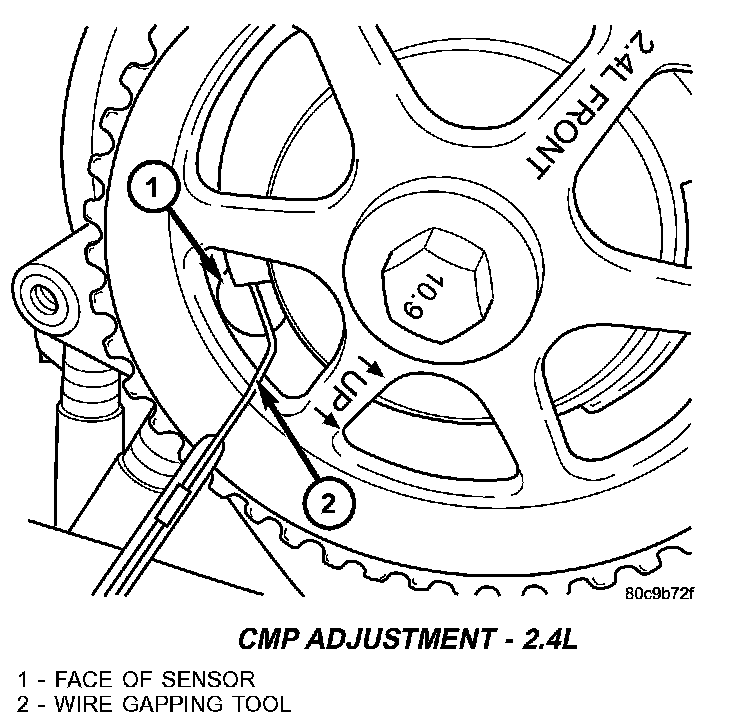 The Camshaft Position Sensor (CMP) on the 2.4L cylinder engine is bolted to the right-front side of the cylinder head. Sensor position (depth) is adjustable.