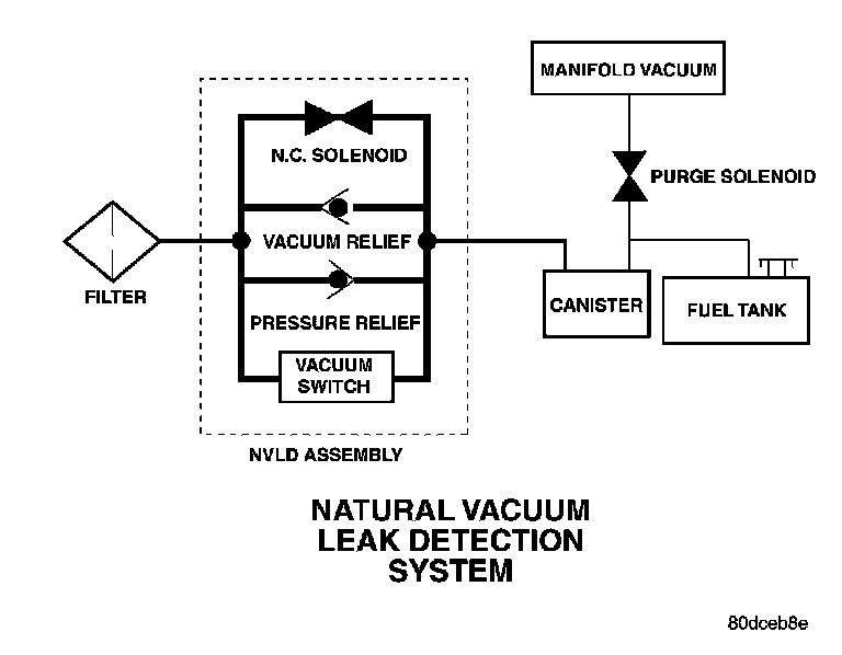 The Natural Vacuum Leak Detection (NVLD) system is the next generation evaporative leak detection system that will first be used on vehicles equipped with the Powertrain Control Module (PCM) or Next Generation Controller (NGC) starting in 2002 M.Y. This new system replaces the leak detection pump as the method of evaporative system leak detection. The current CARB requirement is to detect a leak equivalent to a 0.020 inches (0.5 mm) hole. This system has the capability to detect holes of this size very dependably.