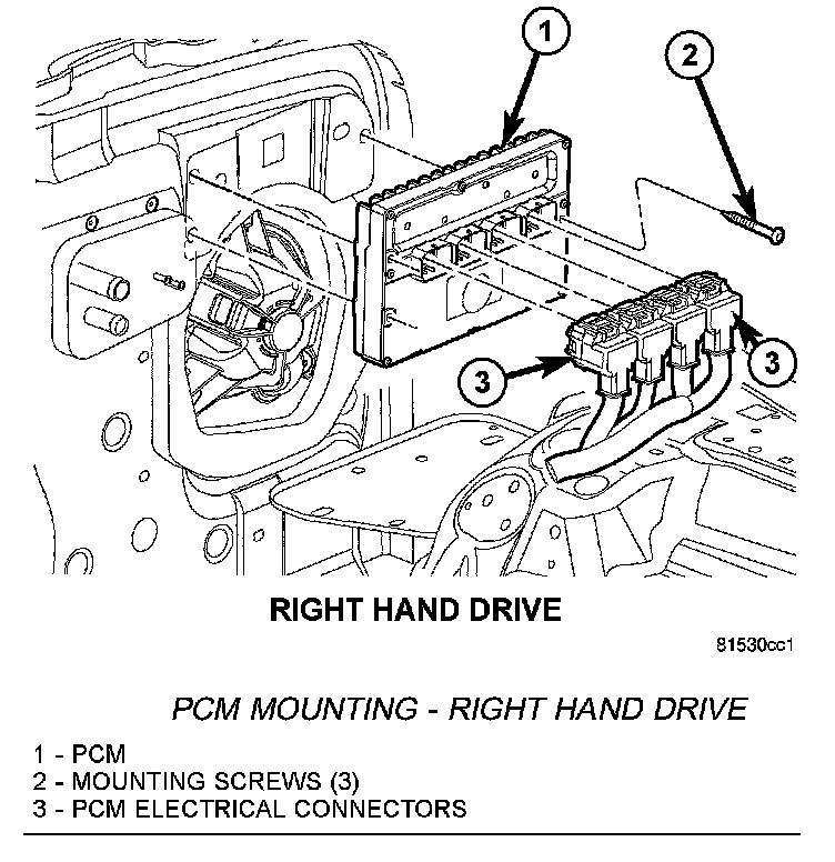 The PCM (1) or (2) is located in the engine compartment. The PCM is referred to as the NGC.