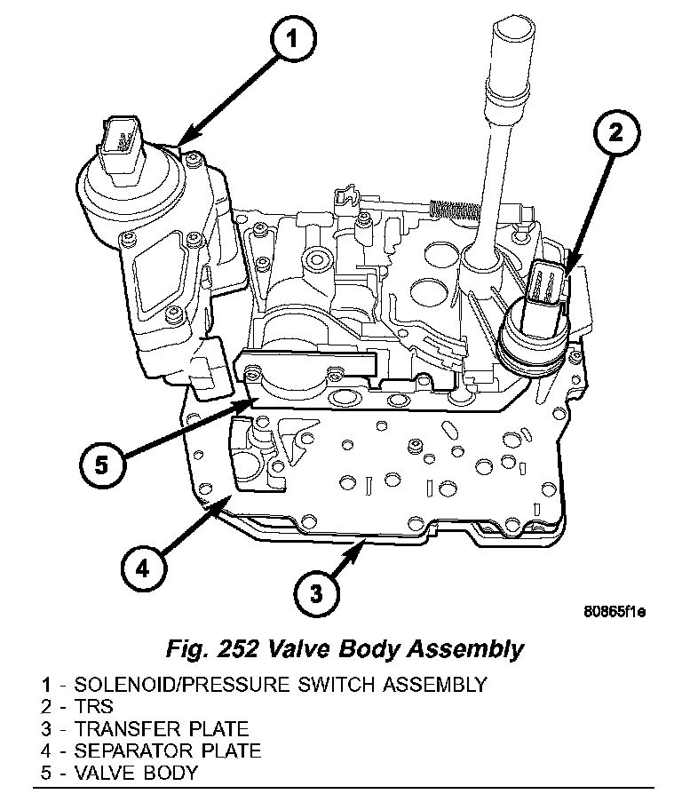 The Transmission Range Sensor (TRS) (2) (Fig. 252) is mounted to the top of the valve body inside the transmission and can only be serviced by removing the valve body assembly. The electrical connector extends through the transmission case.