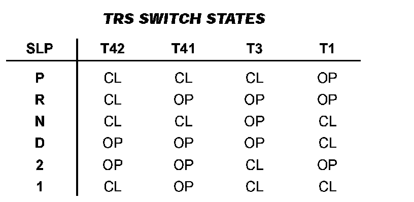 The Transmission Range Sensor (TRS) communicates shift lever position (SLP) to the TCM as a combination of open and closed switches. Each shift lever position has an assigned combination of switch states (open/closed) that the TCM receives from four sense circuits. The TCM interprets this information and determines the appropriate transmission gear position and shift schedule.