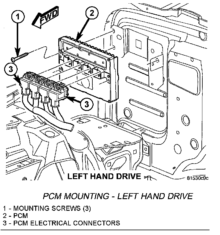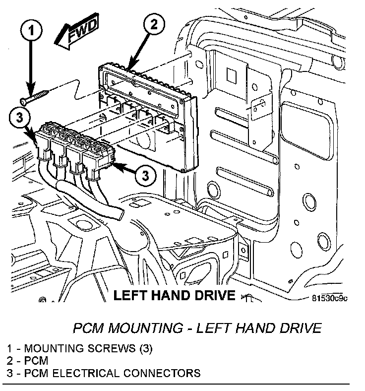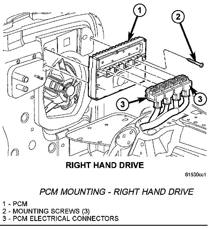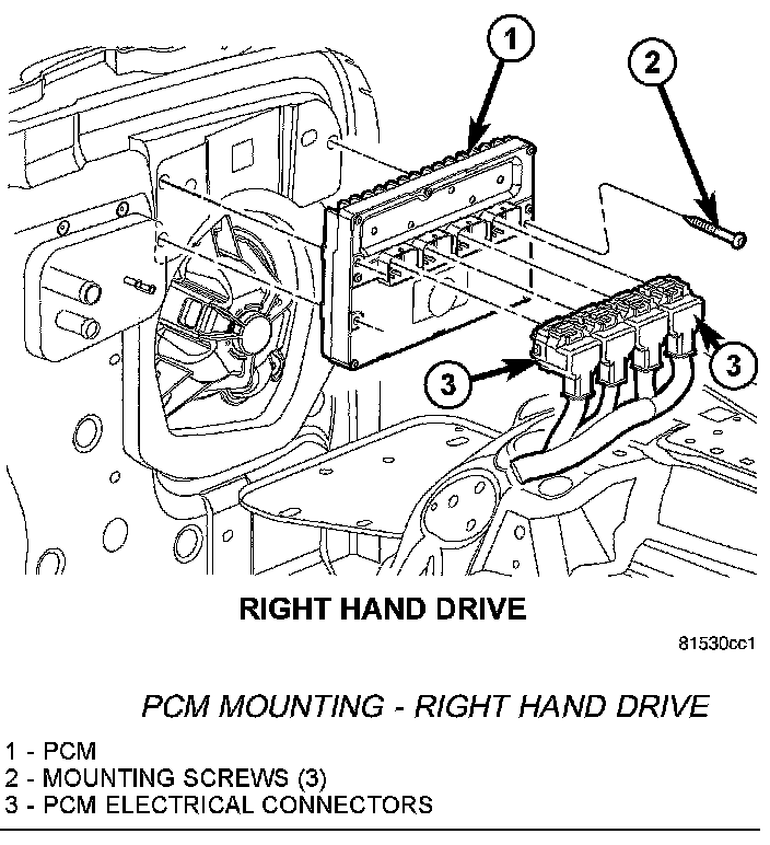 USE THE DRB SCAN TOOL TO REPROGRAM THE NEW POWERTRAIN CONTROL MODULE (PCM) WITH THE VEHICLES ORIGINAL IDENTIFICATION NUMBER (VIN) AND THE VEHICLES ORIGINAL MILEAGE. IF THIS STEP IS NOT DONE, A DIAGNOSTIC TROUBLE CODE (DTC) MAY BE SET.REMOVAL