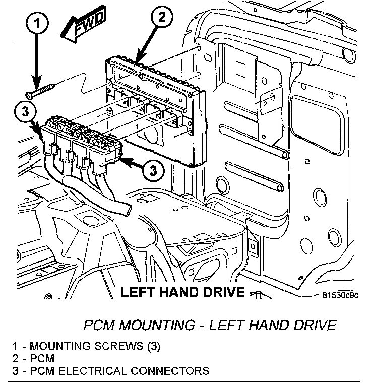 The PCM (2) is located on the right side of the dash panel in the engine compartment on left hand drive vehicles. The PCM is referred to as the NGC.
