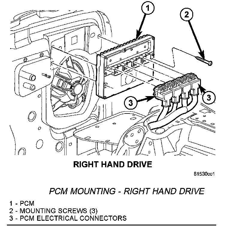 The PCM (1) is located on the left side of the dash panel in the engine compartment on right hand drive vehicles.