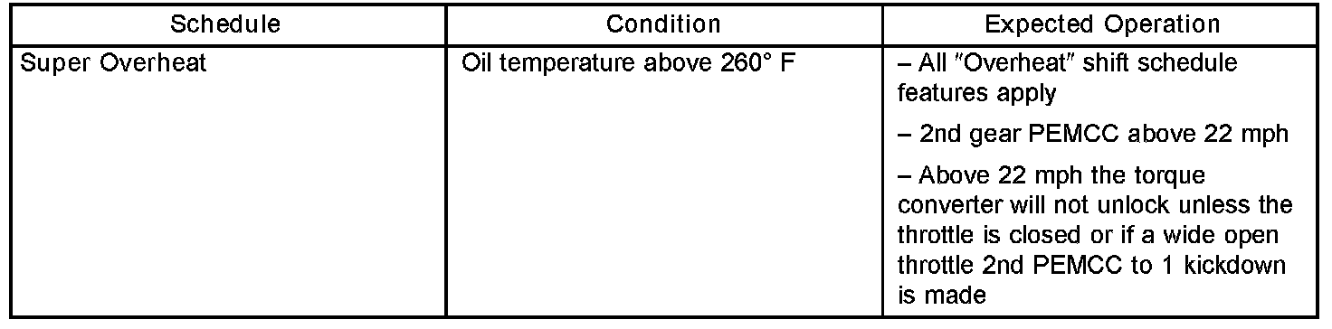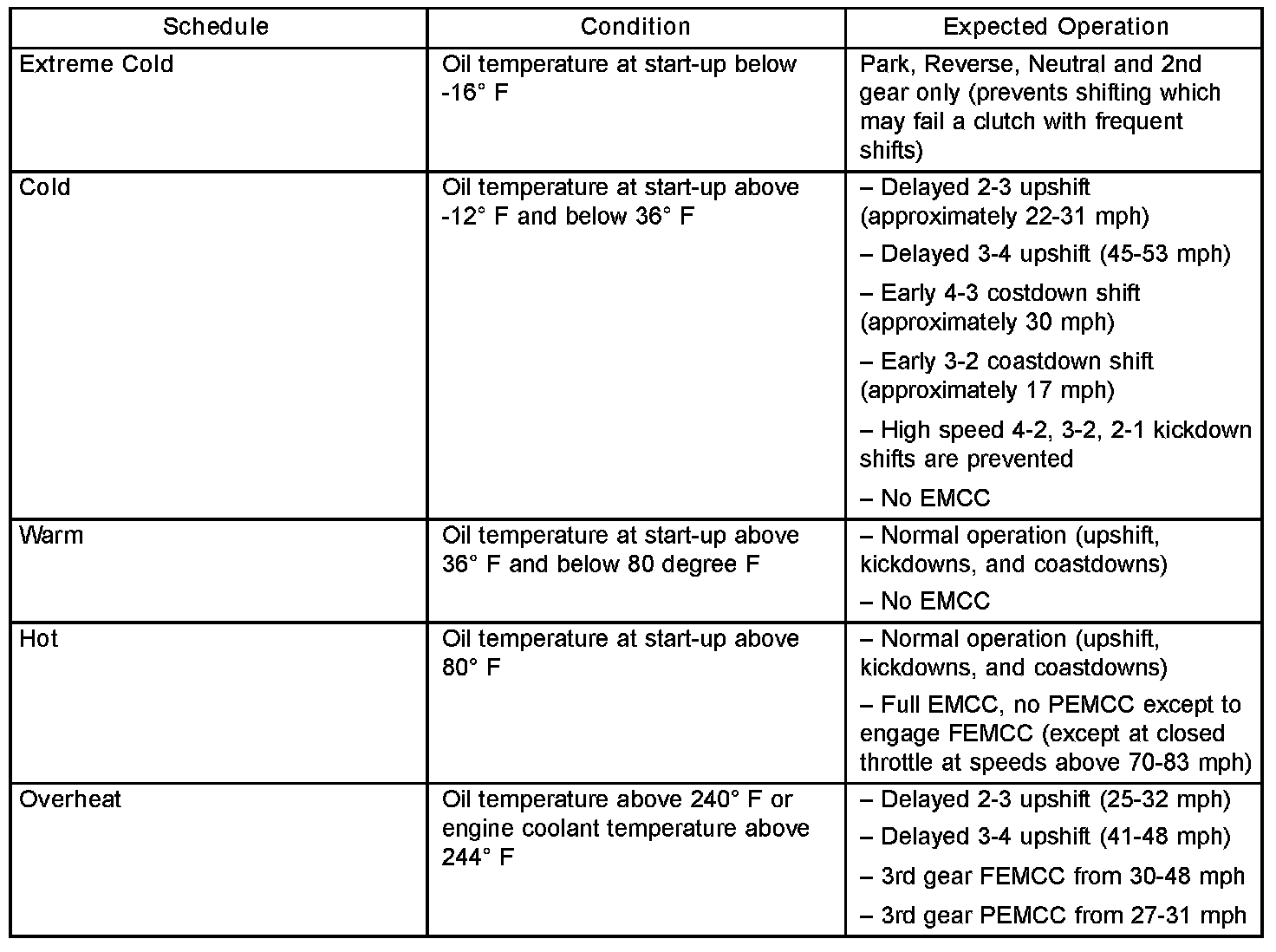 As driving conditions change, the TCM appropriately adjusts the shift schedule. Refer to the following table 42RLE Shift Schedule to determine the appropriate operation expected, depending on driving conditions.