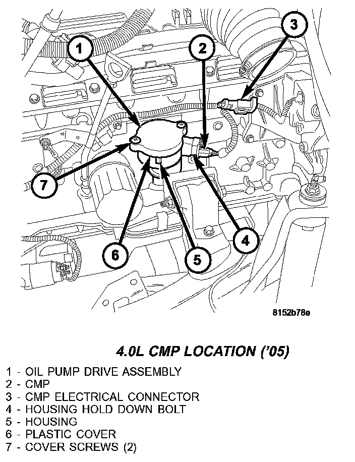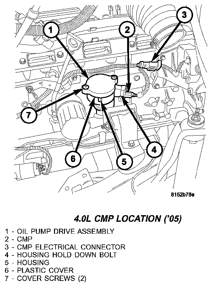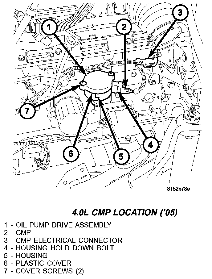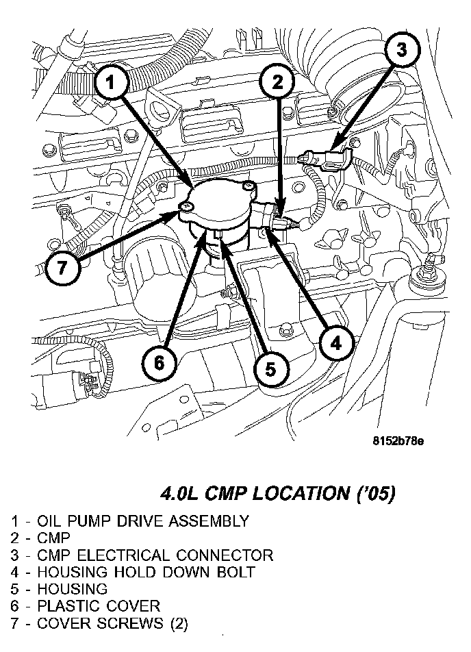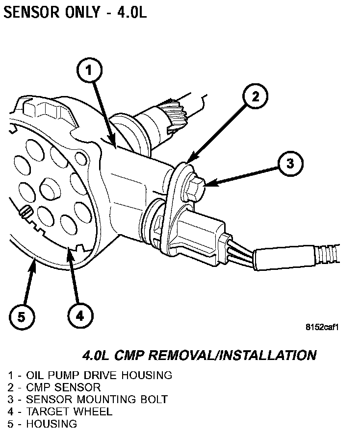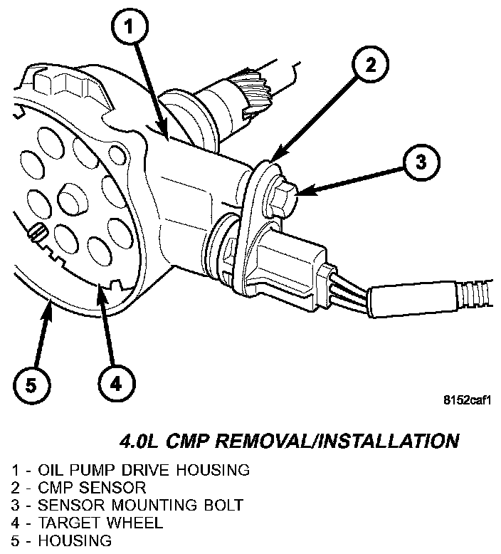 The Camshaft Position Sensor (CMP) on the 4.0L 6 cylinder engine (2) is bolted to the side of the oil pump drive shaft housing assembly (5)