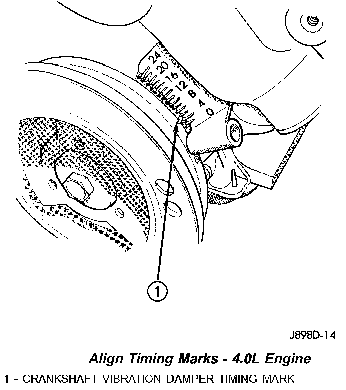 d. Slowly continue to rotate engine. Do this until timing index mark (1) on vibration damper pulley aligns with top dead center (TDC) mark (0 degree) on timing degree scale. Always rotate engine in direction of normal rotation. Do not rotate engine backward to align timing marks.