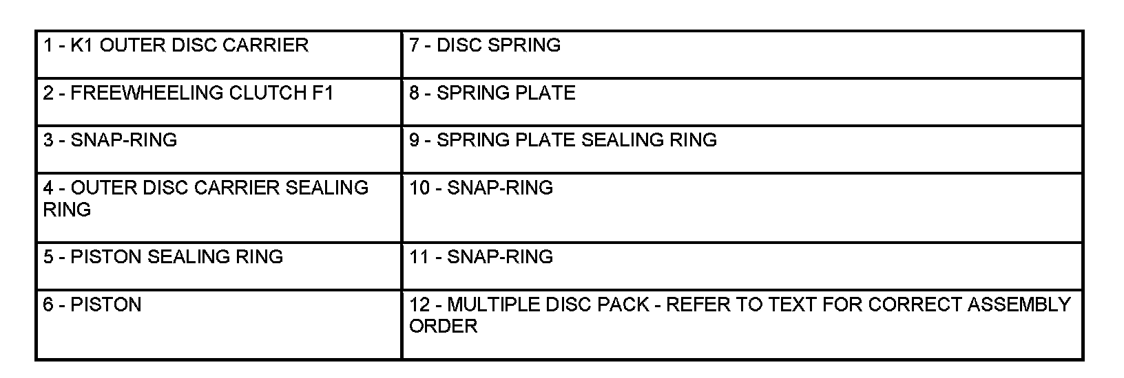 6. Remove snap-ring (3) and take out front freewheeling clutch F1 (2). Take care when removing the F1 clutch to prevent the clutch sprags from falling out. If this occurs, the clutch must be replaced.