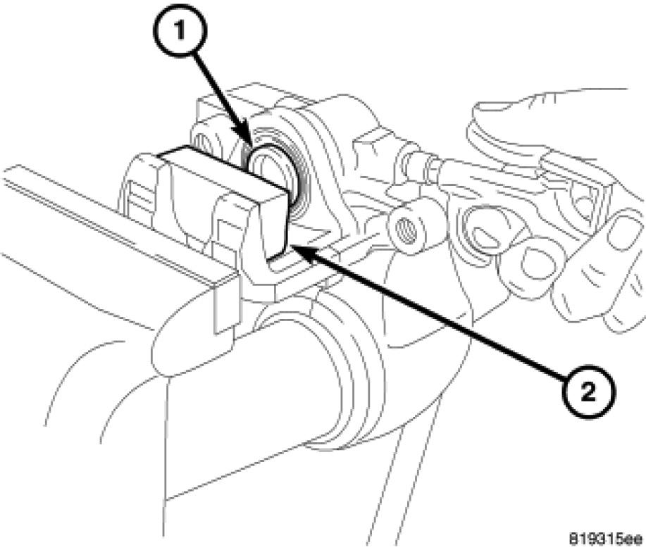 5. Place a wooden block (2) in the caliper as shown.