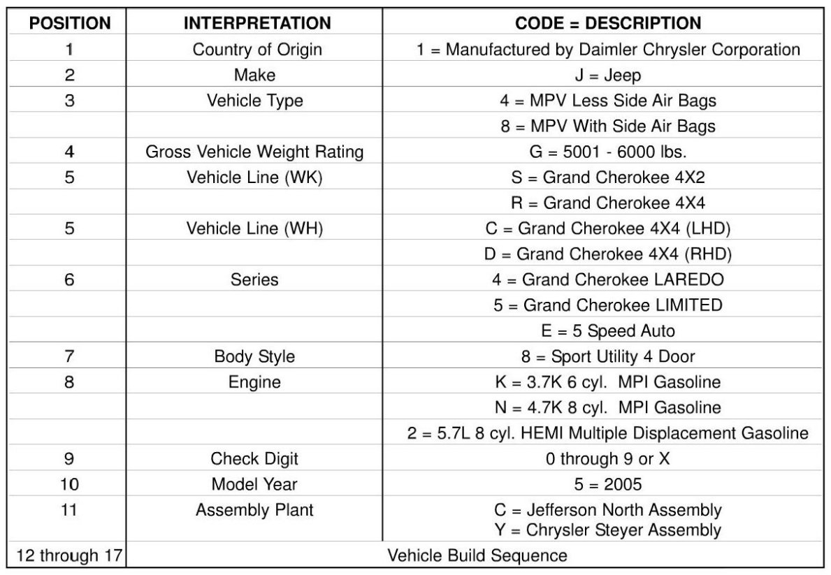 Vehicle Identification Number Decoding Chart