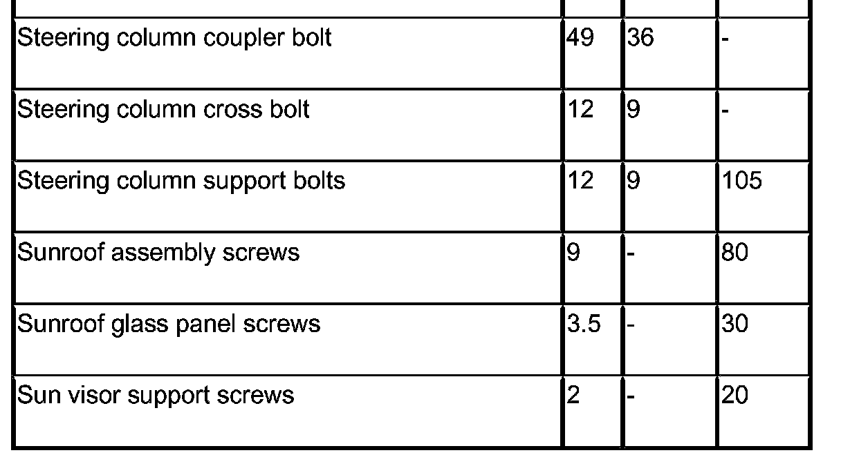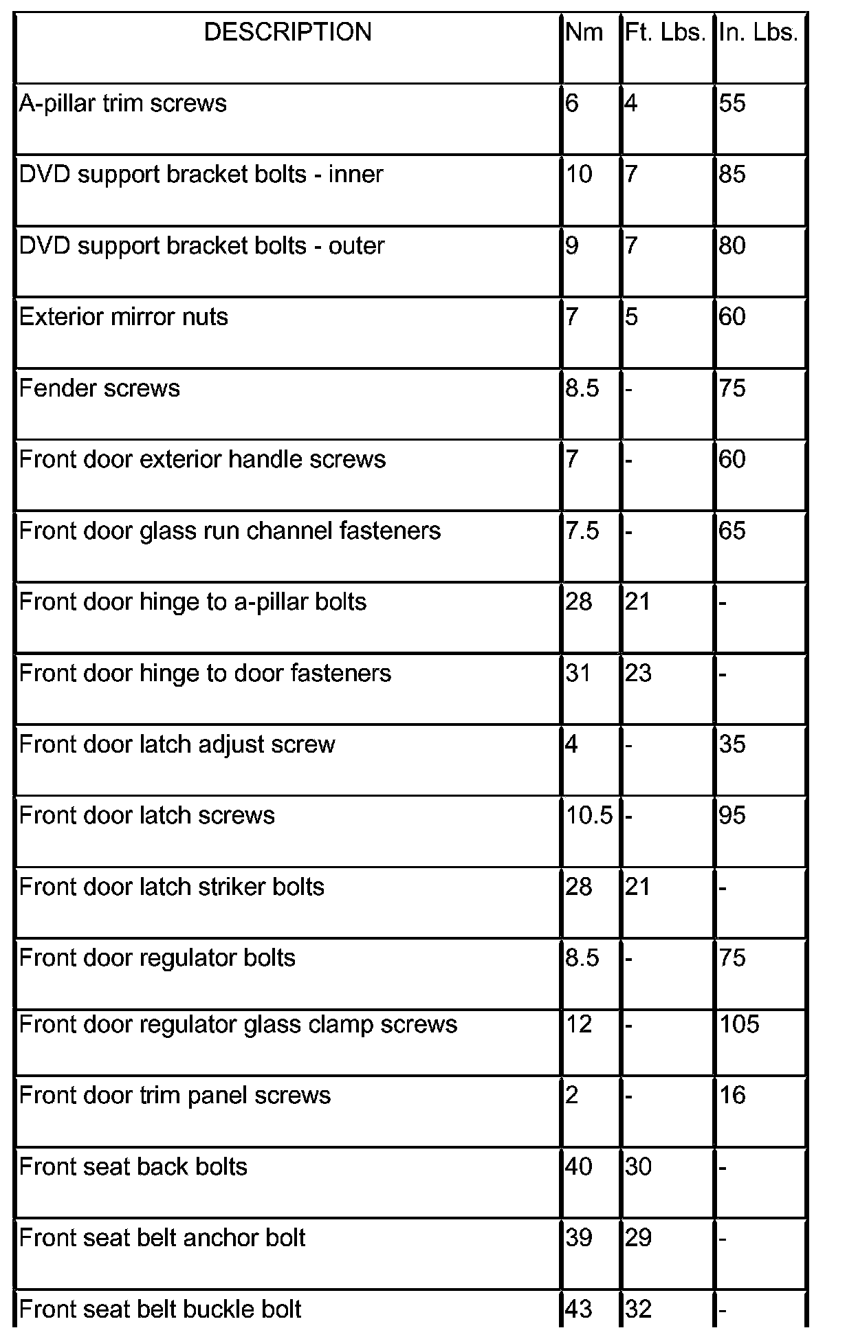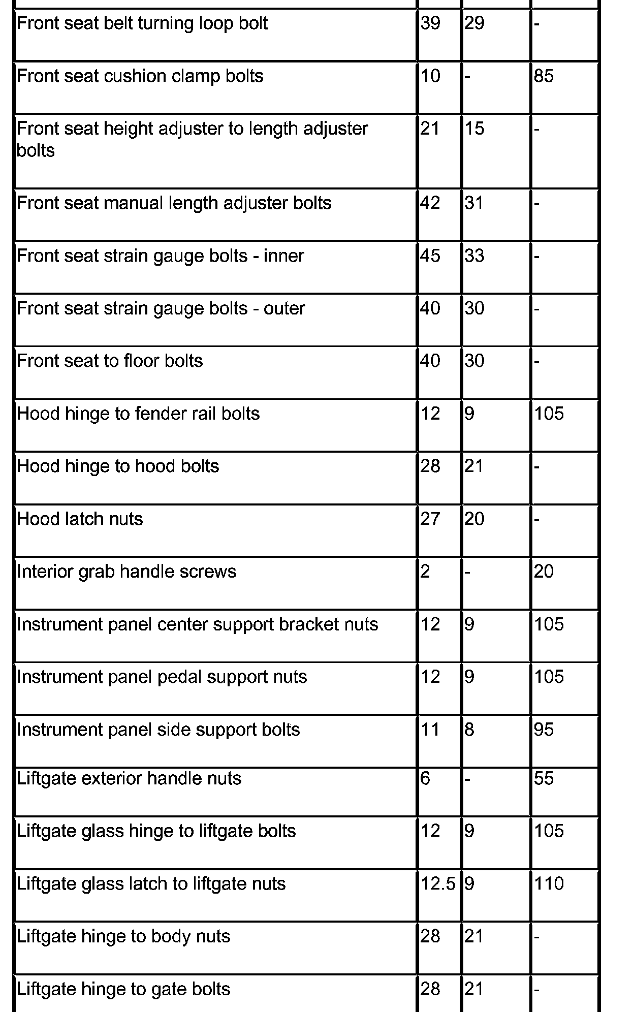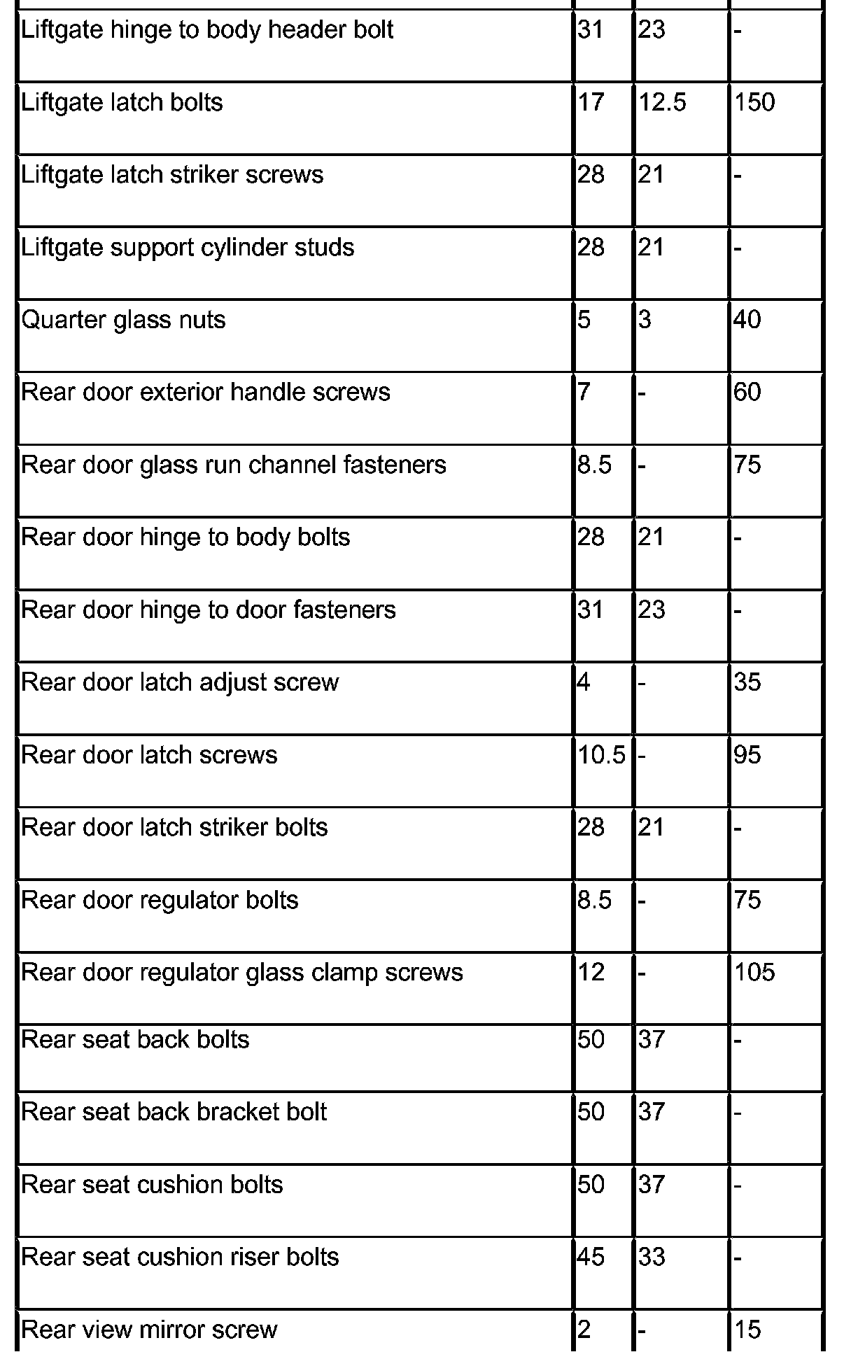 SPECIFICATIONS - TORQUE
