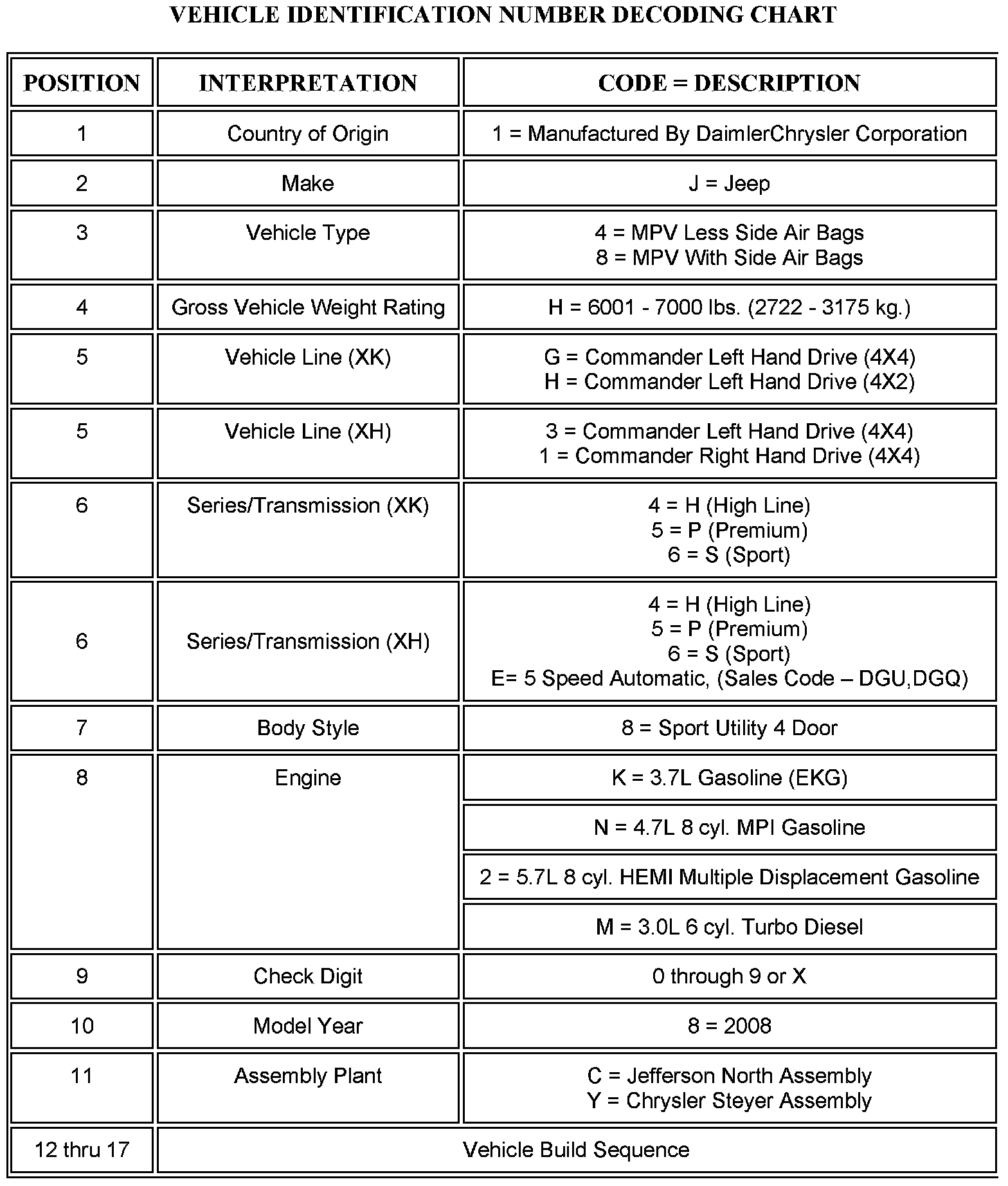 The Vehicle Identification Number (VIN) plate is attached to the top left side of the instrument panel. The VIN contains 17 characters that provide data concerning the vehicle. Refer to the decoding chart to determine the identification of a vehicle.