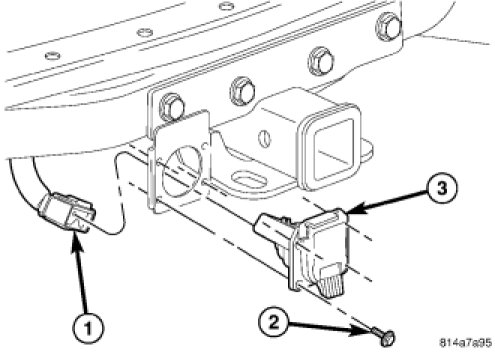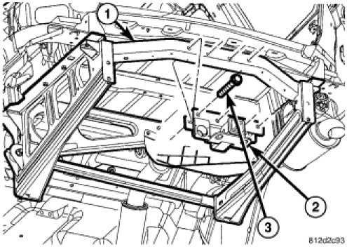 1. Install the hitch (2) onto the rear body cradle (1) and install the bolts (3).