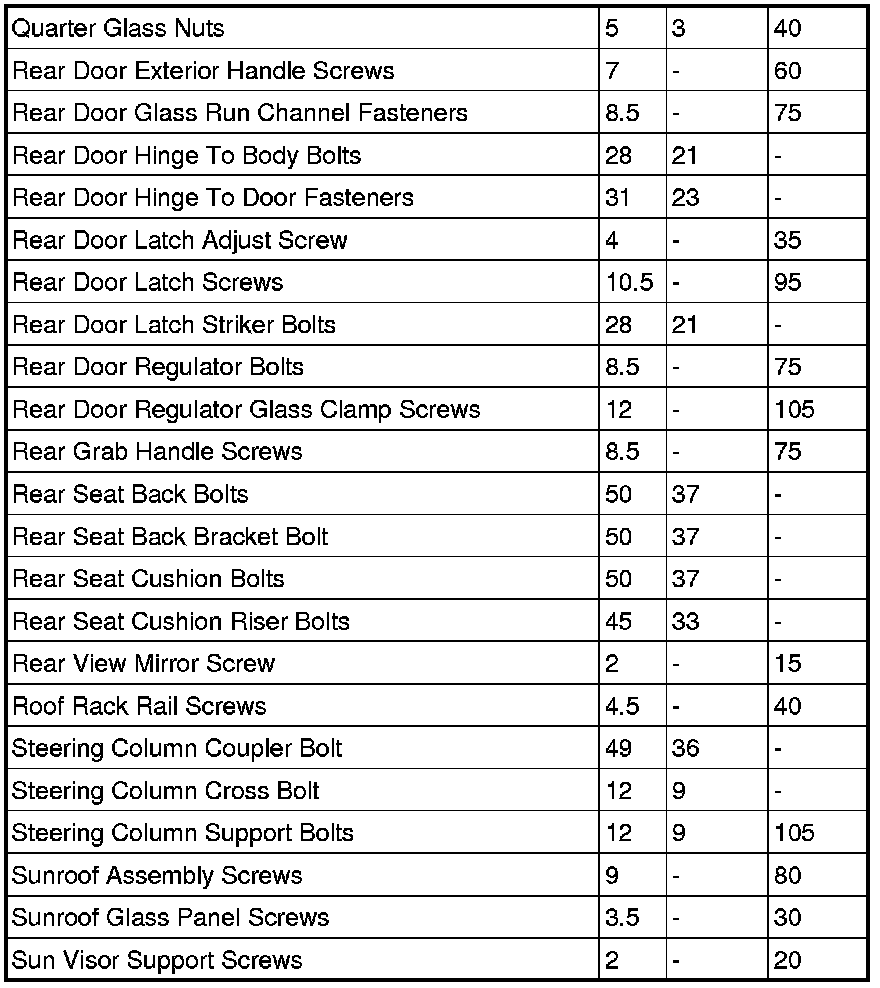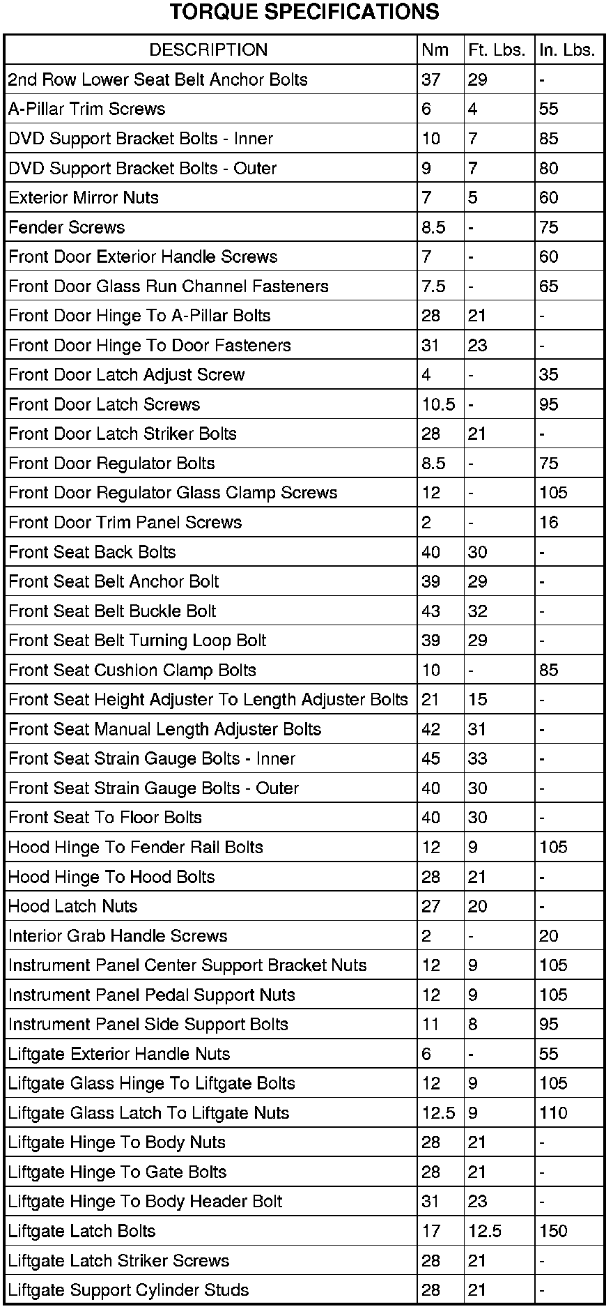 SPECIFICATIONS - TORQUE
