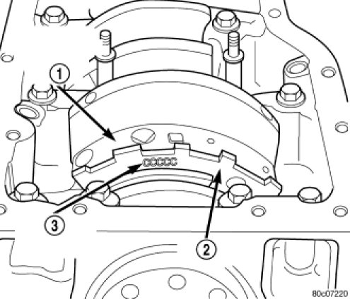 The main bearings are "select fit" to achieve proper oil clearances. For main bearing selection, the crankshaft position sensor target wheel has grade identification marks stamped into it (3). These marks are read from left to right, corresponding with journal number 1, 2, 3, 4 and 5. The crankshaft position sensor target wheel (2) is mounted to the number 8 counter weight (1) on the crankshaft.