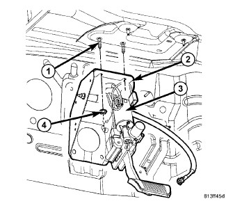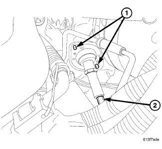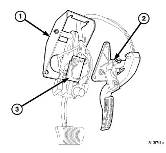 3. Install and tighten the 2 accelerator pedal (2) nuts to 28 Nm ( 21 ft. lbs.).