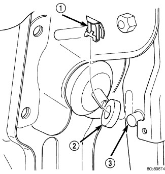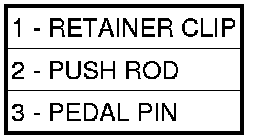 8. Install booster push rod (2) on pedal pin (3) and install retainer clip (1) on pedal pin.