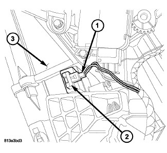 4. Disconnect the HVAC wire harness connector (1) from the evaporator temperature sensor (2) located on the left side of the HVAC housing (3).