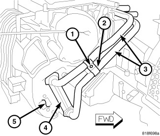 2. Install the retaining bracket (2) and the screw (1) that secures the heater core tubes (3) to the air distribution housing. Tighten the screw to 1.2 Nm (10 in. lbs.)
