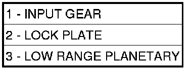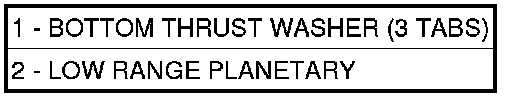 9. Install the bottom thrust washer (3 tabs) (1) into the low range planetary (2).