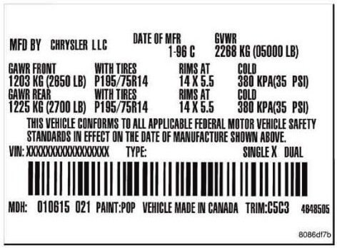 A vehicle certification label is attached to every Chrysler LLC vehicle. The label certifies that the vehicle conforms to all applicable Federal Motor Vehicle Standards . The label also lists: