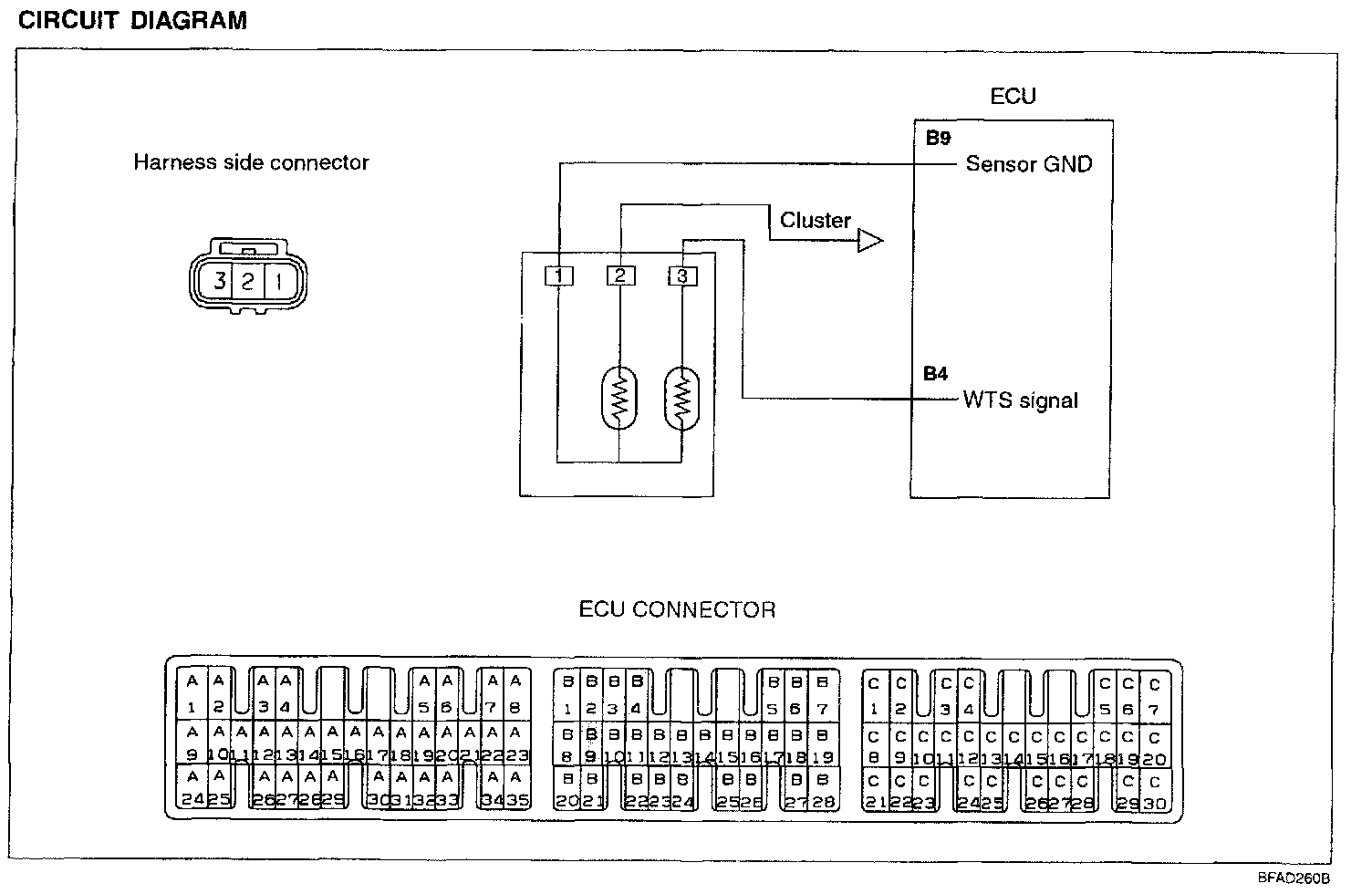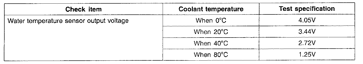 The Water temperature sensor installed in the water passage of the cylinder head detects the water temperature and emits signals to the ECU. This part employs a thermistor which is sensitive to changes in temperature. The electric resistance of the thermistor decreases in response to a temperature rise (NTC). The ECU determines water temperature by the sensor output voltage and provides optimum fuel enrichment when the engine is cold.