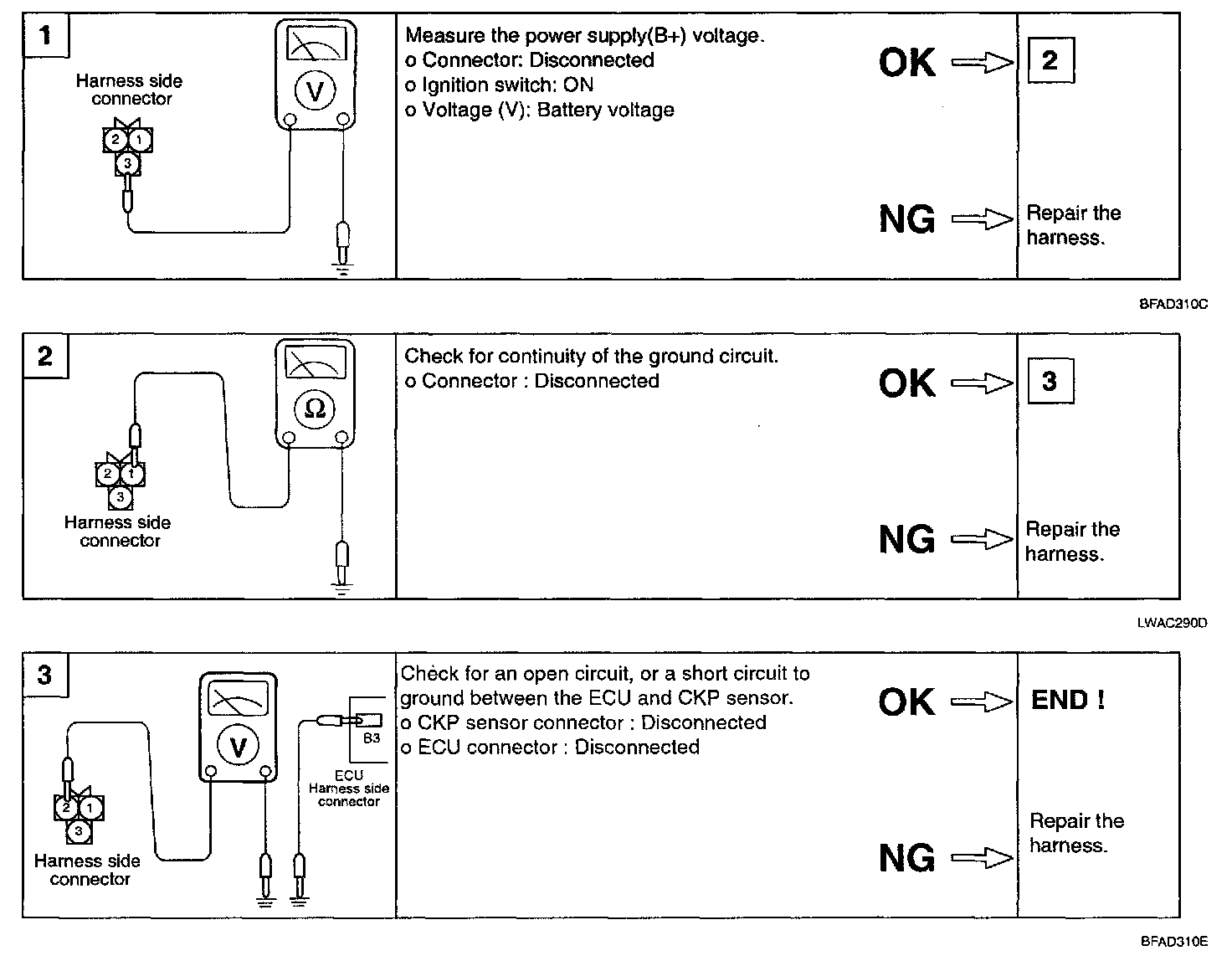 1. If unexpected shocks are felt during driving or the engine stalls suddenly, shake the crankshaft position sensor harness. If this causes the engine to stall, check for poor sensor connector contact.