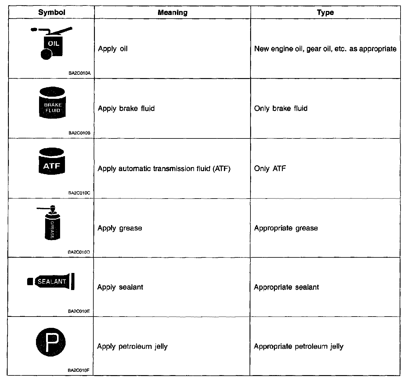 There are six primary symbols used to complement illustrations. These symbols indicate the areas to apply such materials during service.