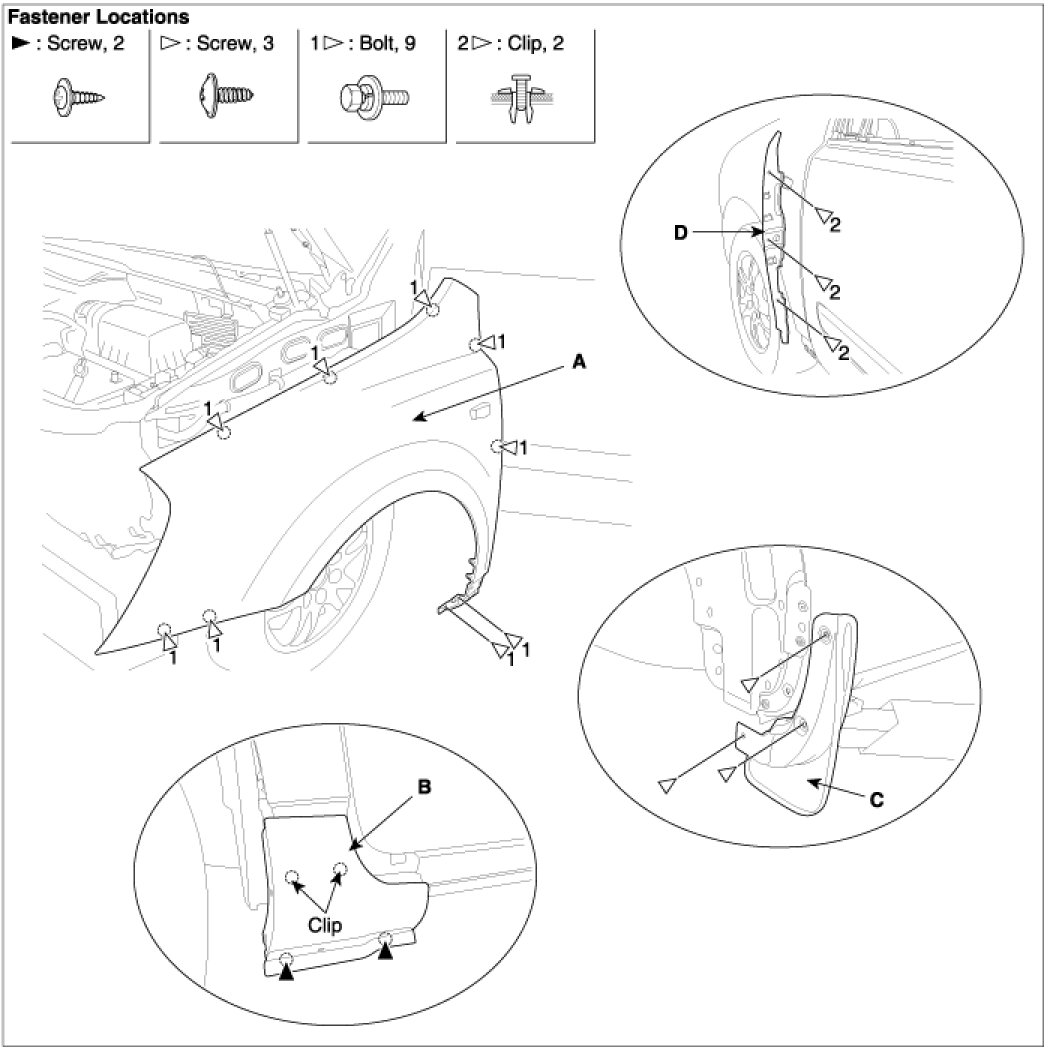 2. After loosening the fender mounting bolts, remove the fender (A).